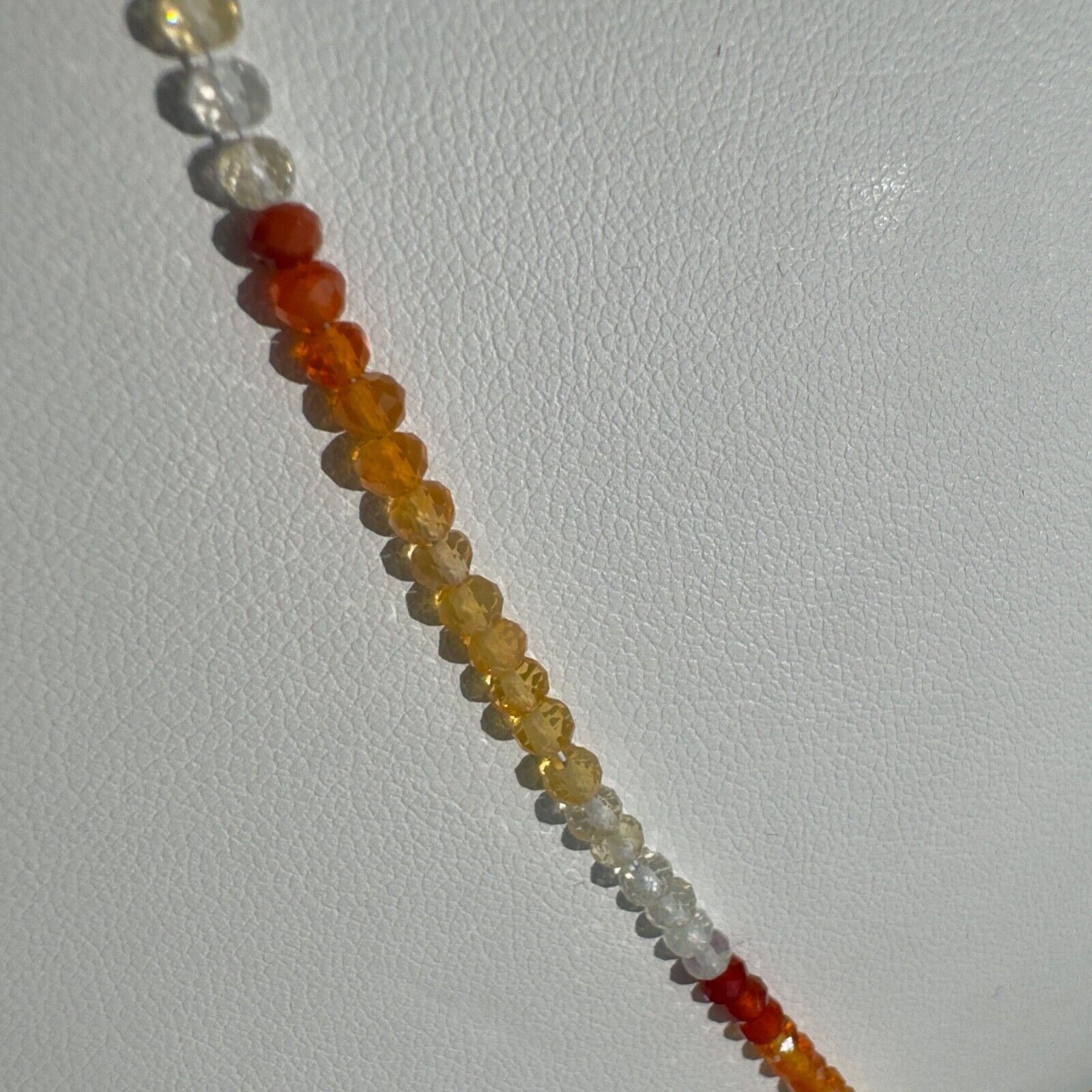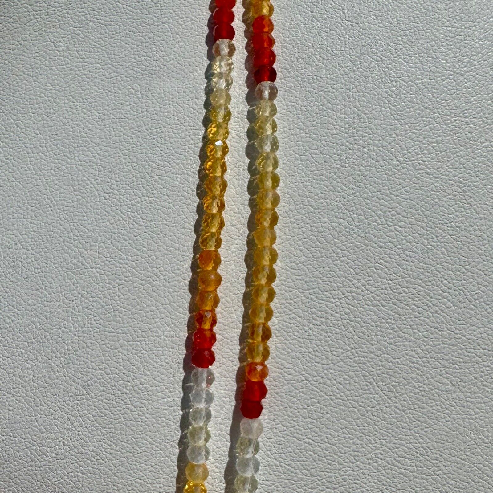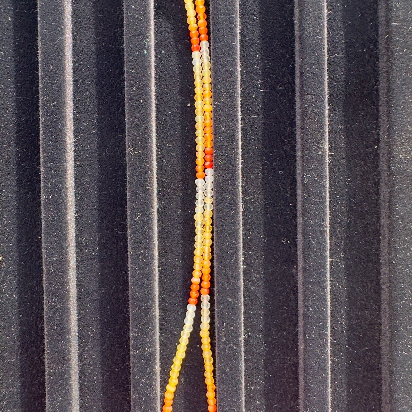 These AAA+ Mexican Fire Opal Faceted Roundel Beads are a beautiful piece of jewelry. The shiny surface and the white, red, orange, yellow tones make these pearls a real eye-catcher. The roundel shape and the strand ensure a unique look and a pleasant wearing comfort. Made in Ethiopia and weighing + 22 carats, these beads are a high quality choice for jewelry making. The faceting gives them a special fascination and makes them a perfect accessory for any occasion. With a size of 3 mm, they are perfect for the design of bracelets, earrings and necklaces. White, red, orange, yellow tones A beach is 43 cm long. The beads are threaded directly on a finished steel strand, so that you can simply put a closure on it and there is a finished beautiful necklace ready in just a few minutes and you can also create other jewelry with the beads and the wire