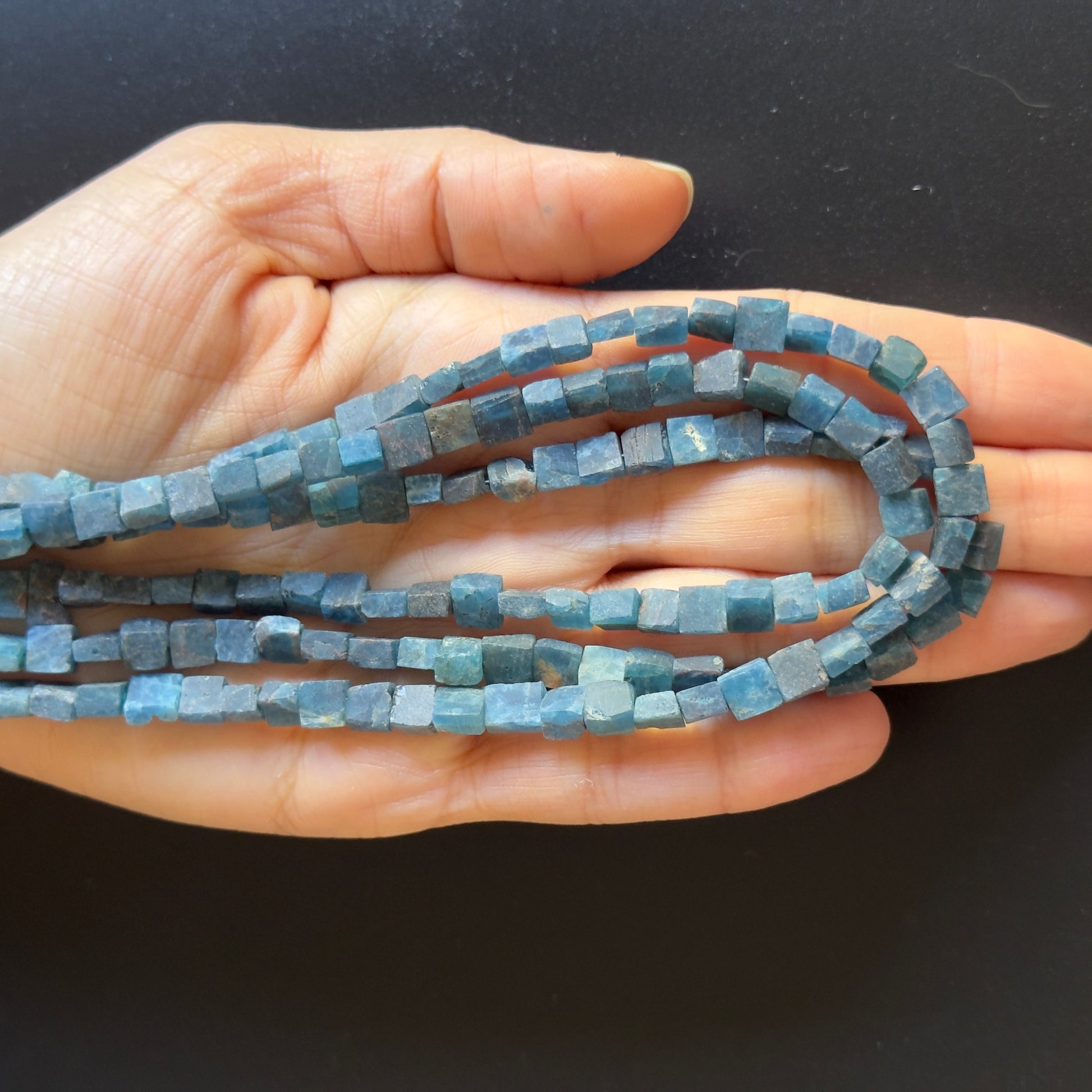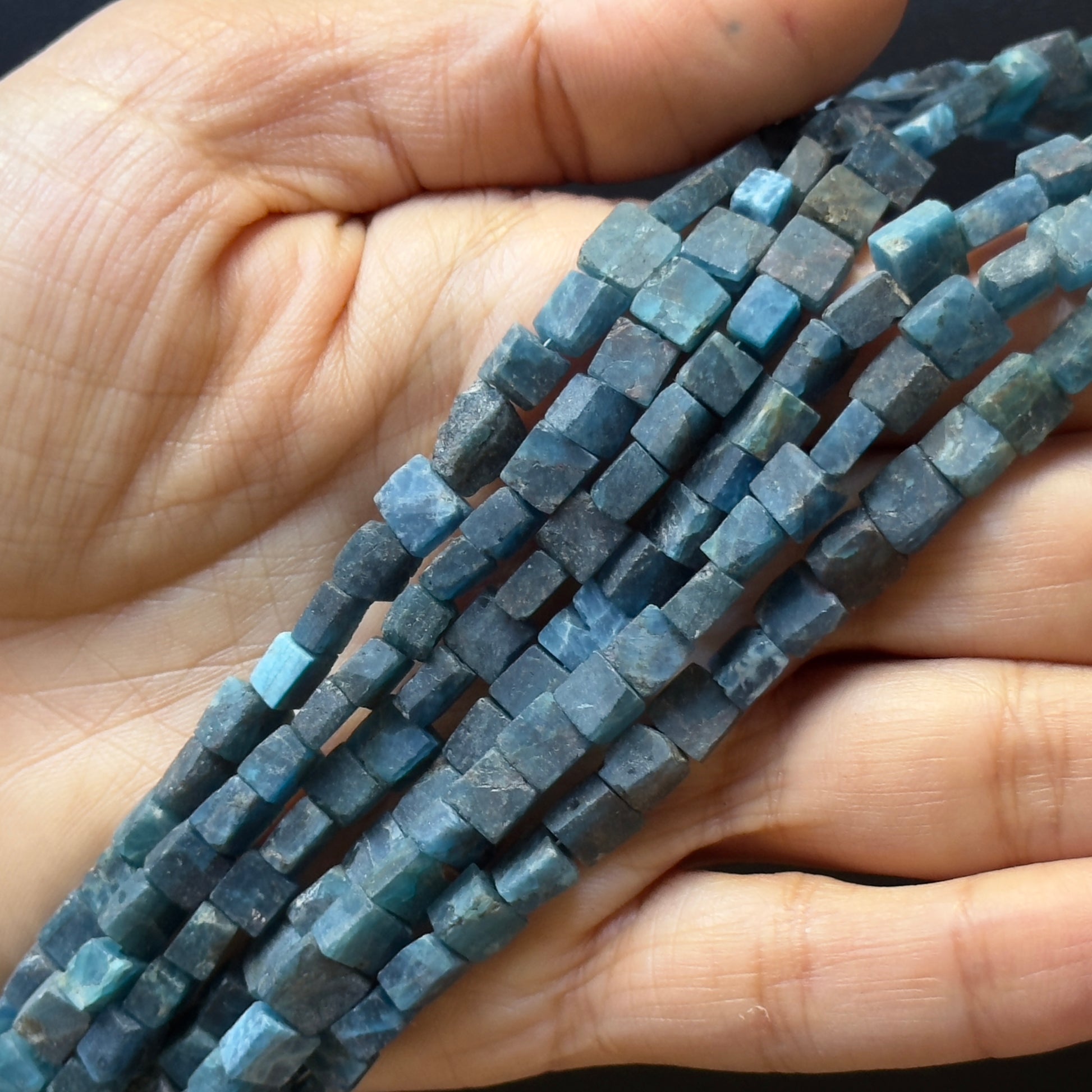 Infuse your jewelry creations with earthy elegance using these raw hand-cut Apatite rectangular cube beads. Featuring a striking mix of deep teal, sea blue, and natural inclusions, each bead is uniquely faceted into a rough cube shape, giving off an organic, rustic charm. These unpolished beauties are perfect for artisan, bohemian, and healing stone-inspired designs.