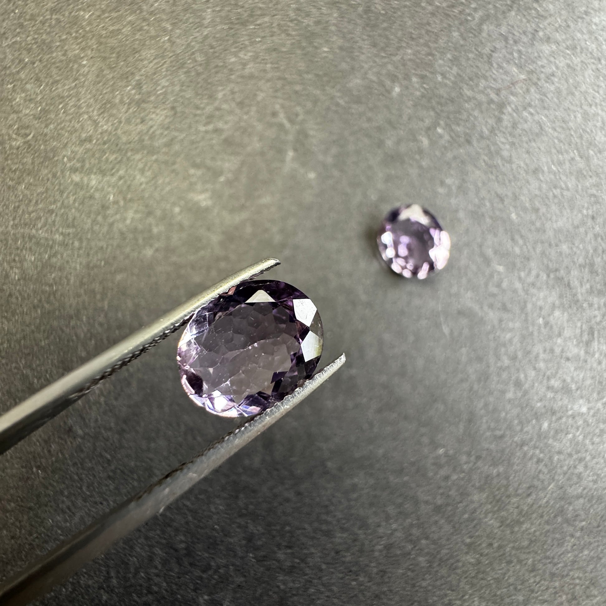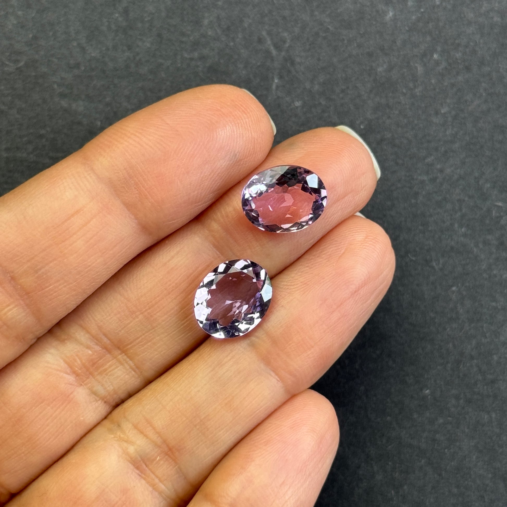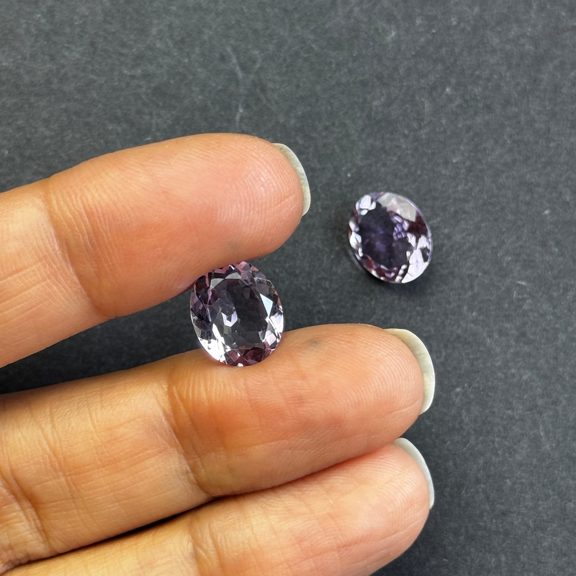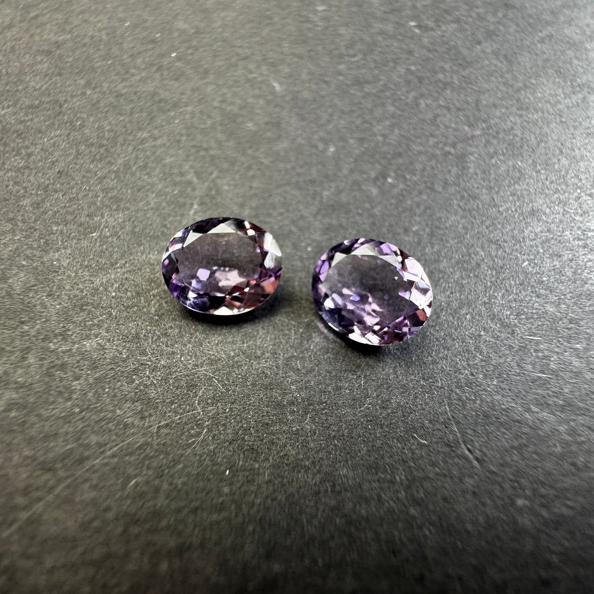 Diese Edelsteine sind oval, transparent und haben eine leuchtend violette Farbe. Mit einem Gewicht von 2,60 und 2,78 Karat und einer Größe von 11 x 9 mm eignet sich der Edelstein perfekt für jedes Schmuckstück. Die Reinheit ist außergewöhnlich, ohne Einschlüsse, und der Edelstein wurde einer Wärmebehandlung unterzogen. Da er aus Deutschland importiert wird, kann jedes Stück leicht farblich variieren.