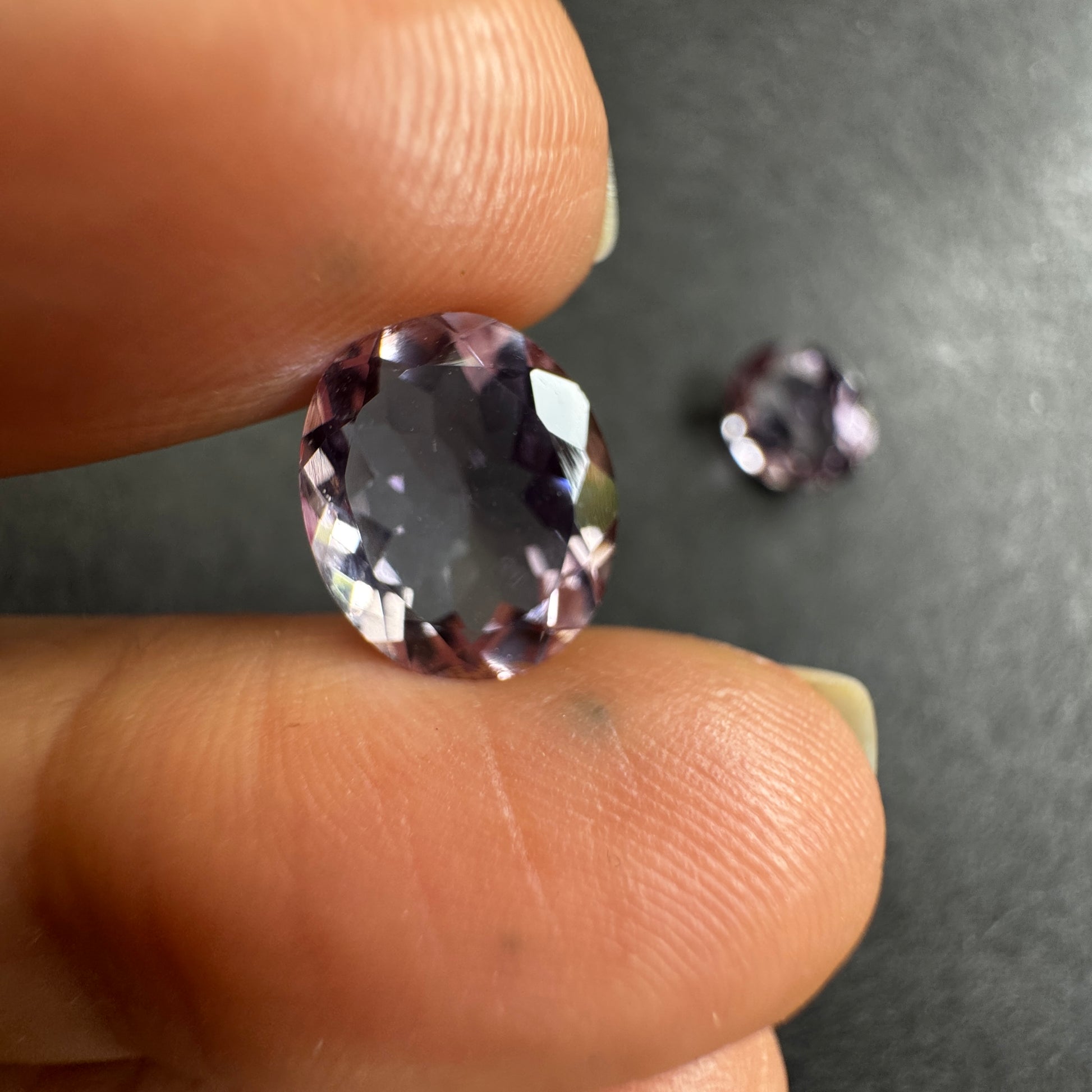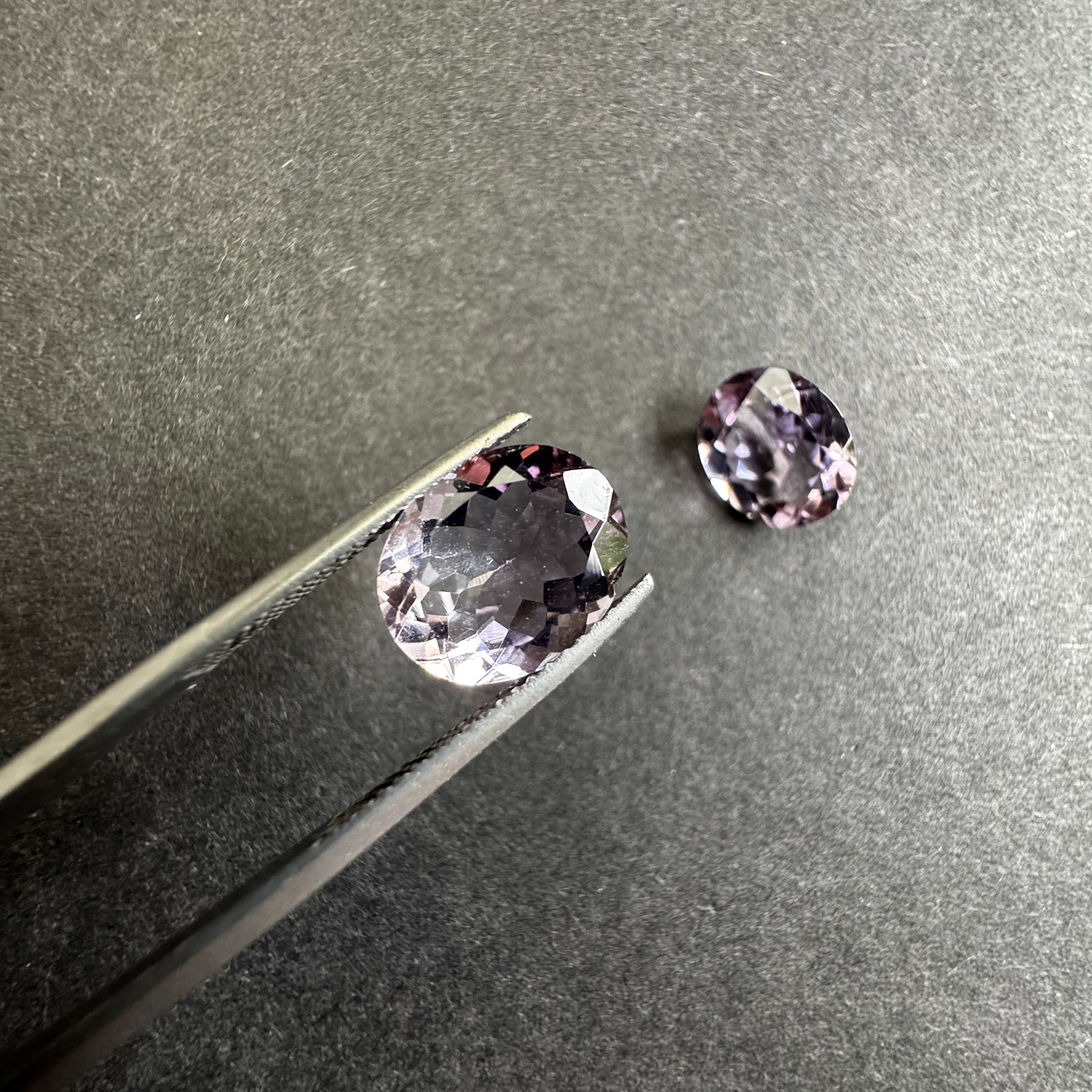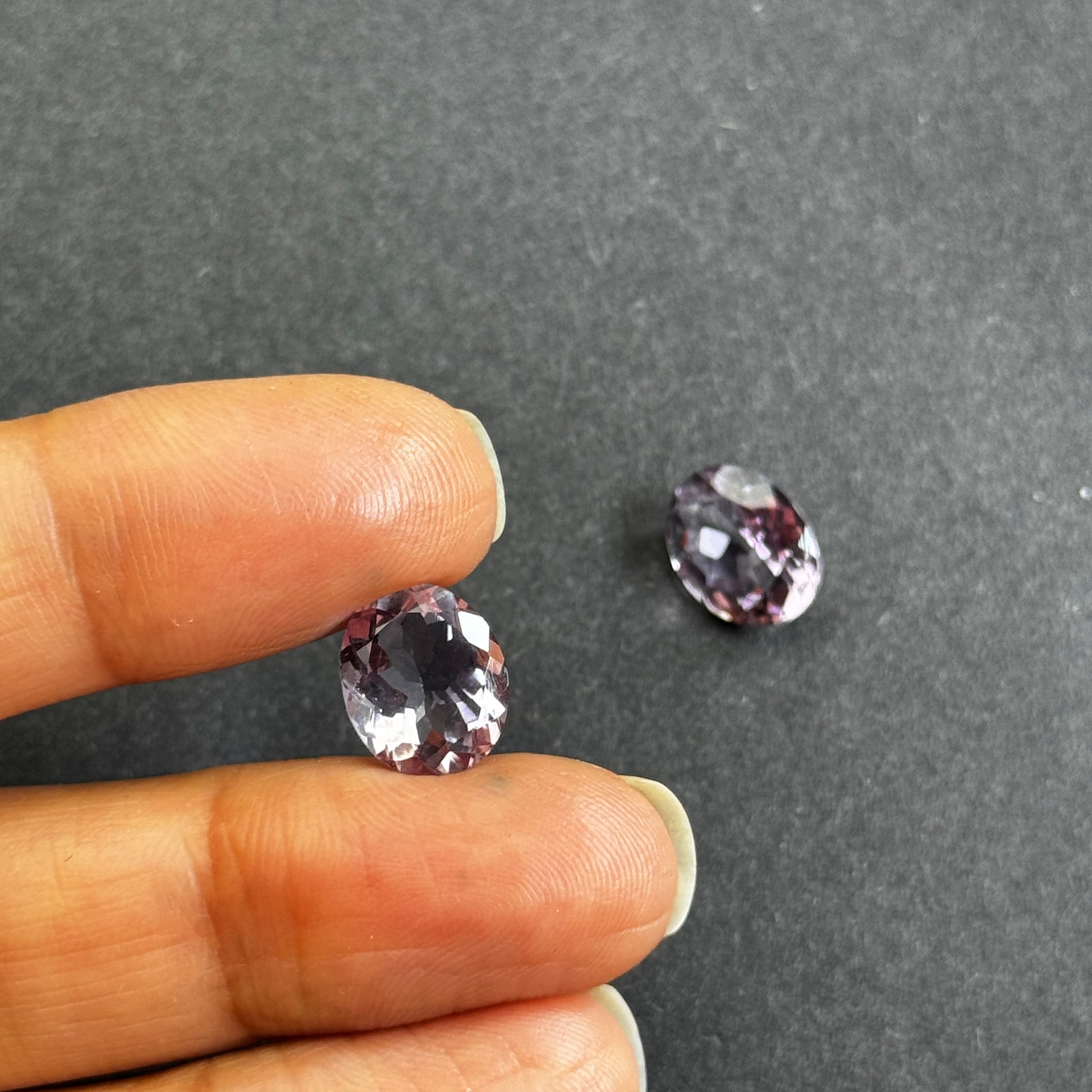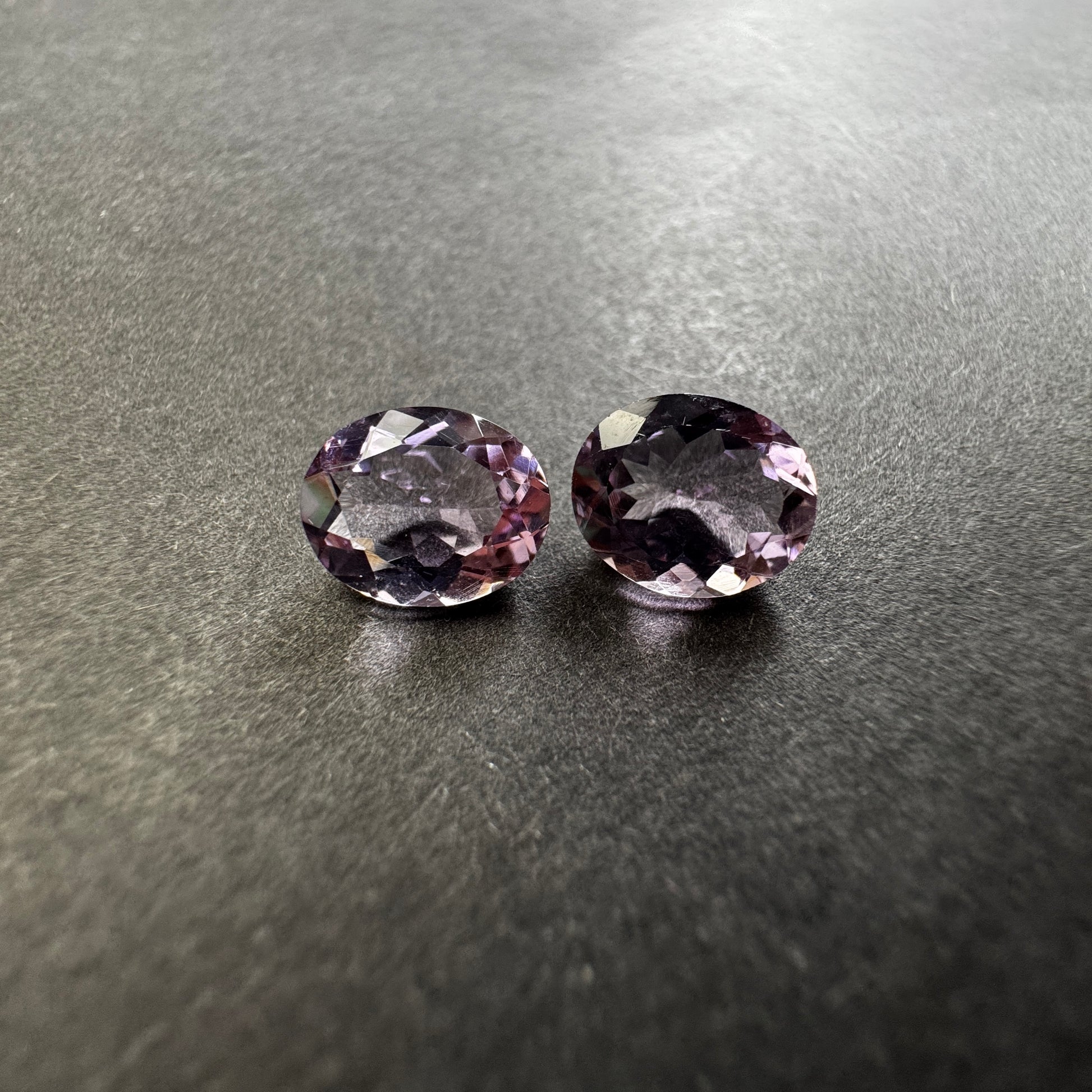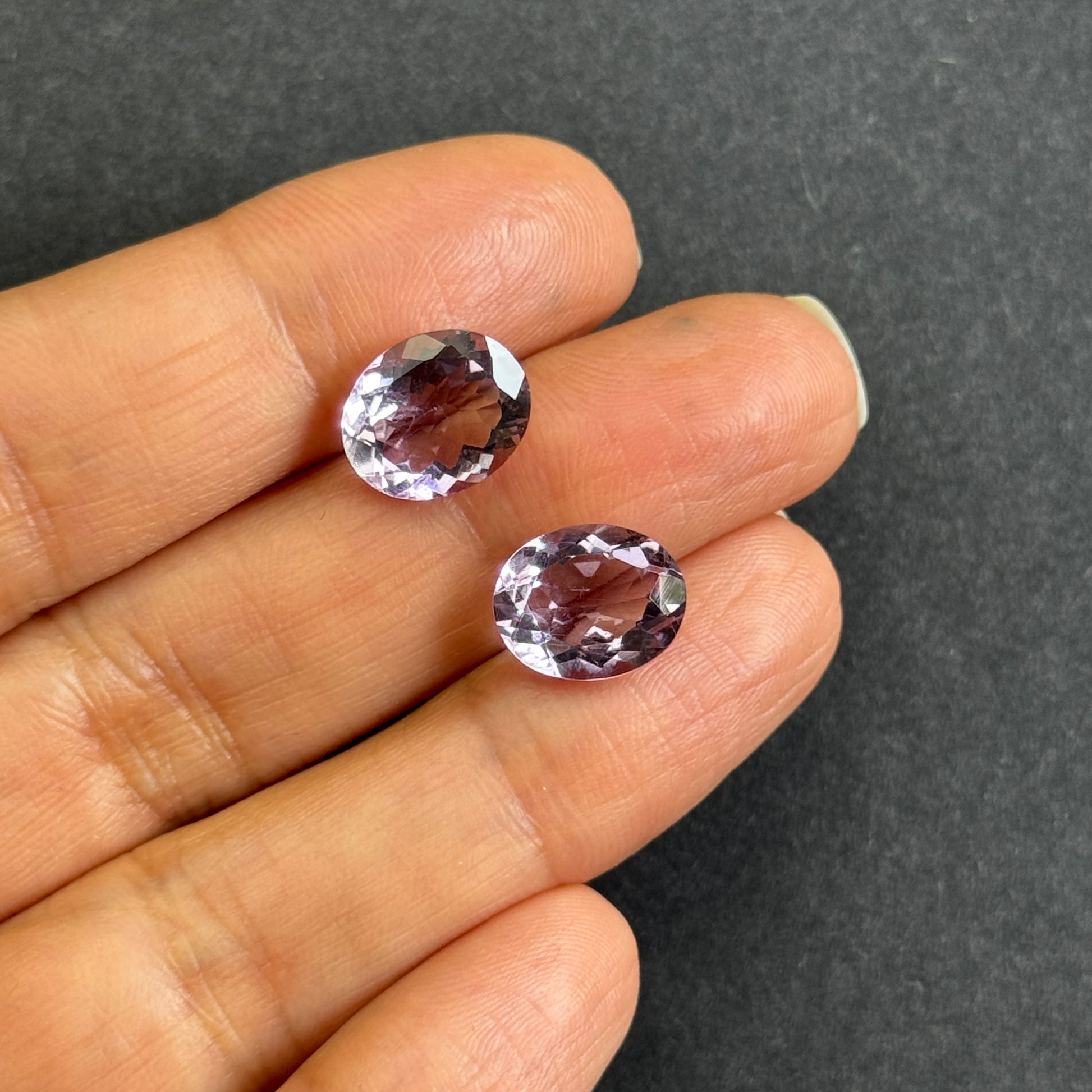 Diese Edelsteine sind oval, transparent und haben eine leuchtend violette Farbe. Mit einem Gewicht von 2,91 und 2,99 Karat und einer Größe von 11 x 9 mm eignet sich der Edelstein perfekt für jedes Schmuckstück. Die Reinheit ist außergewöhnlich, ohne Einschlüsse, und der Edelstein wurde einer Wärmebehandlung unterzogen. Da er aus Deutschland importiert wird, kann jedes Stück leicht farblich variieren.