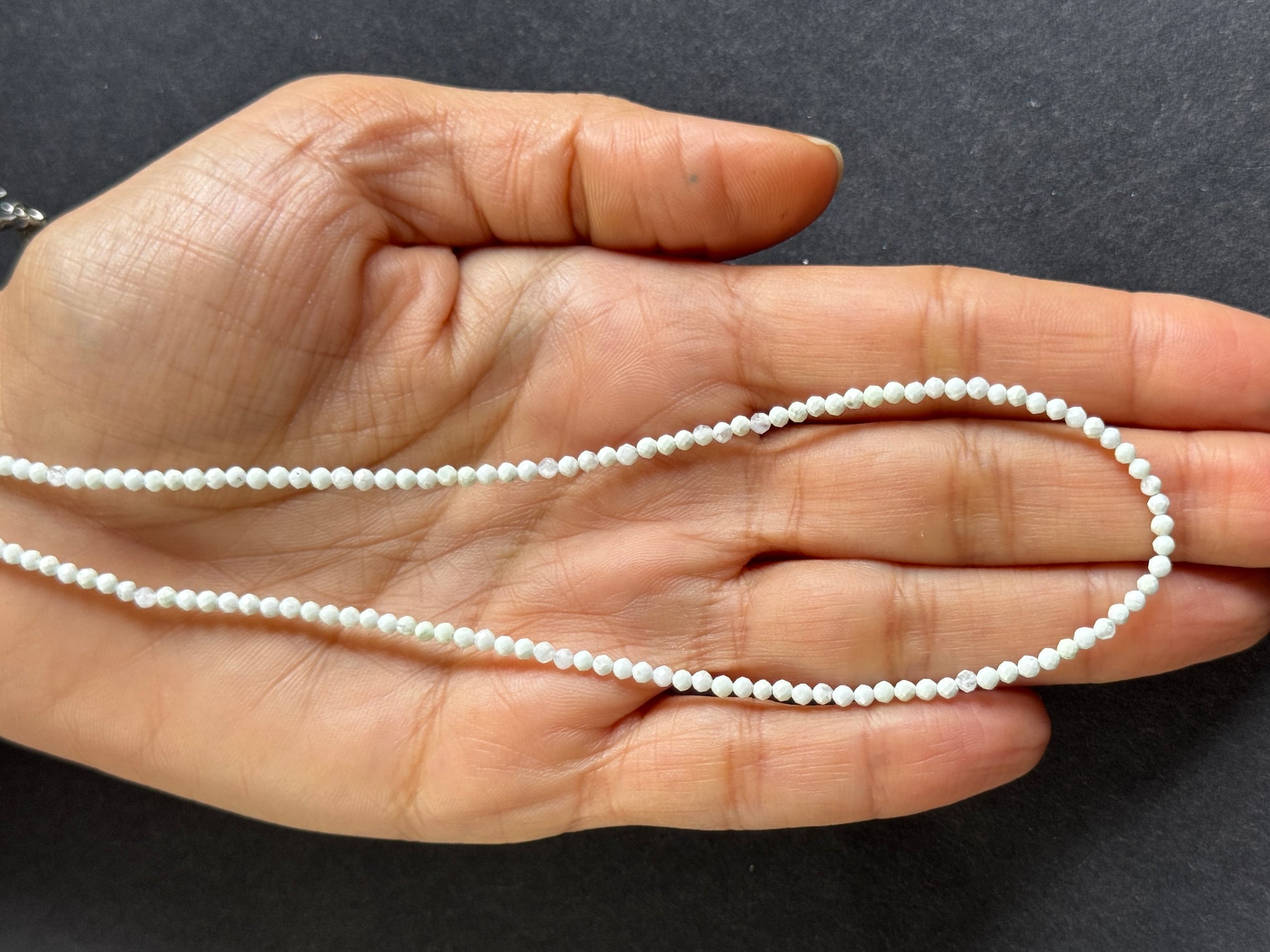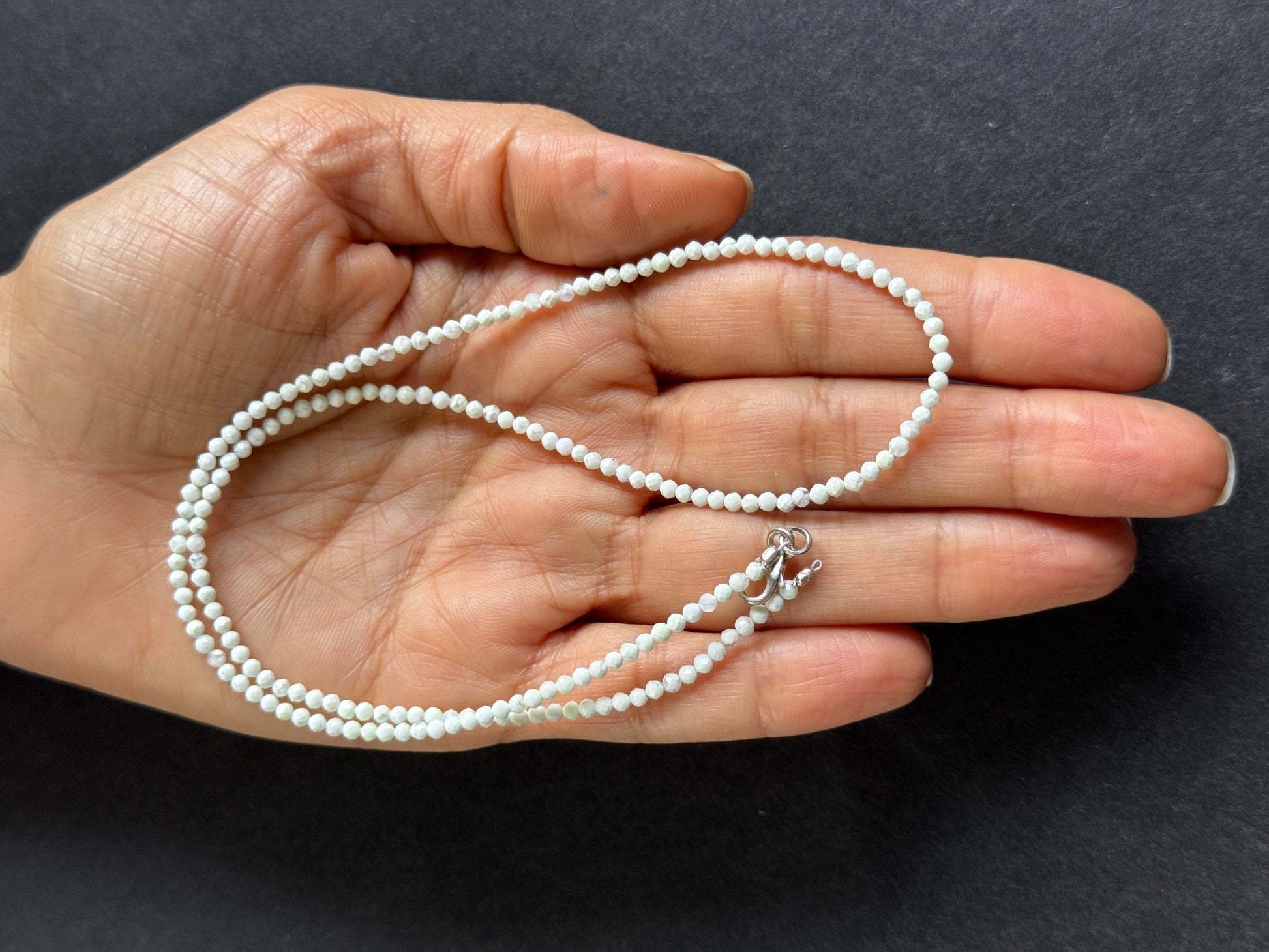 This exquisite necklace features light apple green chrysoprase beads with delicate white highlights, crafted into finely faceted round micro beads. Each bead catches the light subtly, adding a soft shimmer and enhancing the stone’s natural beauty. Perfect for those seeking a gentle pop of colour, this piece combines understated elegance with a fresh, unique charm that complements any outfit beautifully.