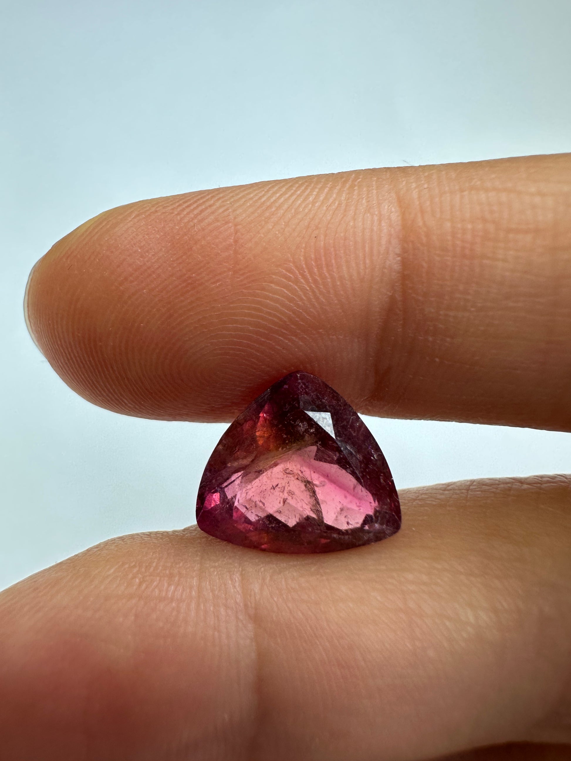 Dieser echte Turmalin-Edelstein TR373 hat ein stattliches Gewicht von 5,12 Karat und eine attraktive Dreiecksform. Dieser rosafarbene Edelstein besticht durch seine transparente Klarheit und natürliche Einschlüsse. Dank seines fachmännischen Schliffs verleiht dieser Edelstein jeder Sammlung Eleganz.